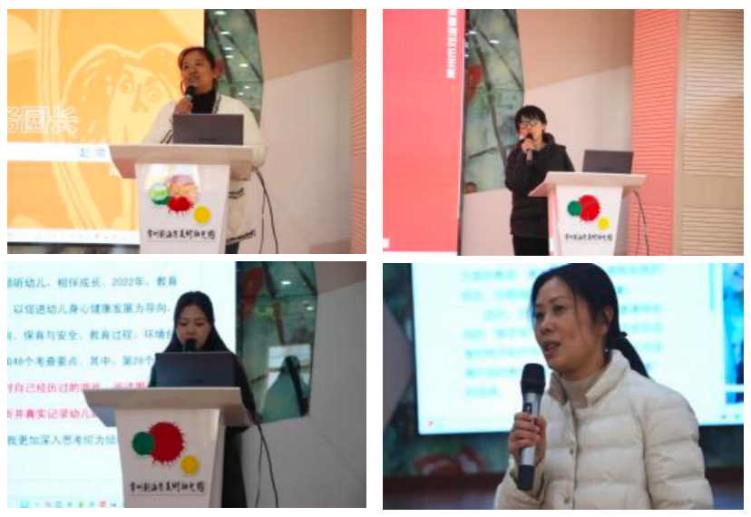 副园长蔡琴分享了《教师专业发展与园所文化建设的双向滋养》讲座,提出以“艺术教研共同体、美学素养工作坊 ”为核心载体,搭建教师专业成长阶梯;保教主任傅佳涵进行了《深度聚焦一对一倾听,以专业支持幼儿生长》分享,详细拆解了一对一倾听的实践策略,通过精细化记录捕捉幼儿的思维闪光;教发主任羊伊人进行了《你好 红色——基于幼儿园艺趣儿童工作室的色彩探究》的分享,展现了以“红色 ”为探究起点,设计沉浸式、游戏化的色彩探究活动。最后,园长黄海燕进行了主题为 《从统一要求走向实践梯度选择——“游戏故事 ”的“ 以退为进 ”》分享,给学员们带来了管理思维革新,倡导尊重幼儿的主体性与表达意愿,让游戏故事成为记录幼儿成长、反思教育实践的重要载体。