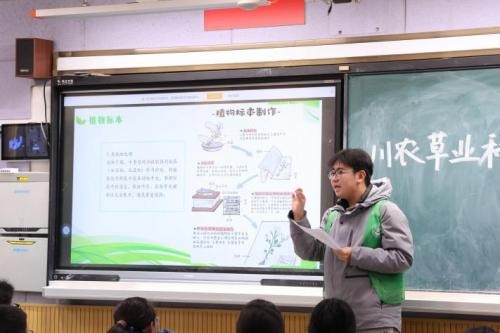 为搭建高校与中学、幼儿园之间的桥梁,传播专业知识与成长经验,“草沐春晖”实践团分赴温江、双流、古蔺等地,开展“青青寸草心”主题支教活动。在温江中学,团队通过视频展播、专业讲解与互动答疑,将植物形态、生态系统等知识生动 呈现,激发青少年对自然科学的兴趣。在双流棠湖中学与古蔺 白沙中学,队员结合学科特色,从生活与科研角度介绍专业前 景,并通过植物标本制作演示,展现草学专业的实践价值。在 成都华林幼儿园与爱迪阳光幼儿园,志愿者以通俗语言普及植物常识,带领孩子们创作拼贴画、制作罐头盆栽,在动手实践 中培育其观察能力与自然情怀。